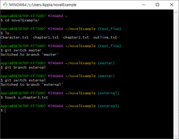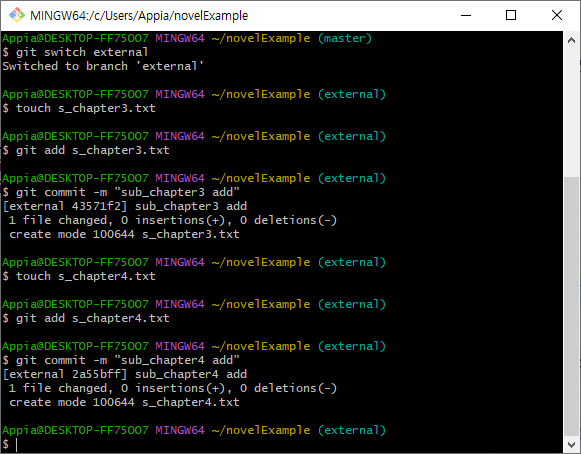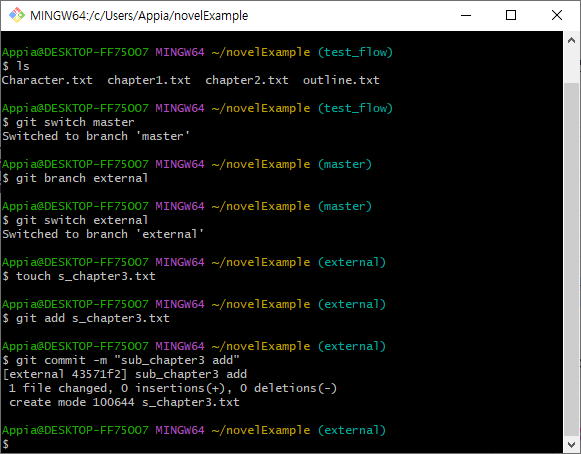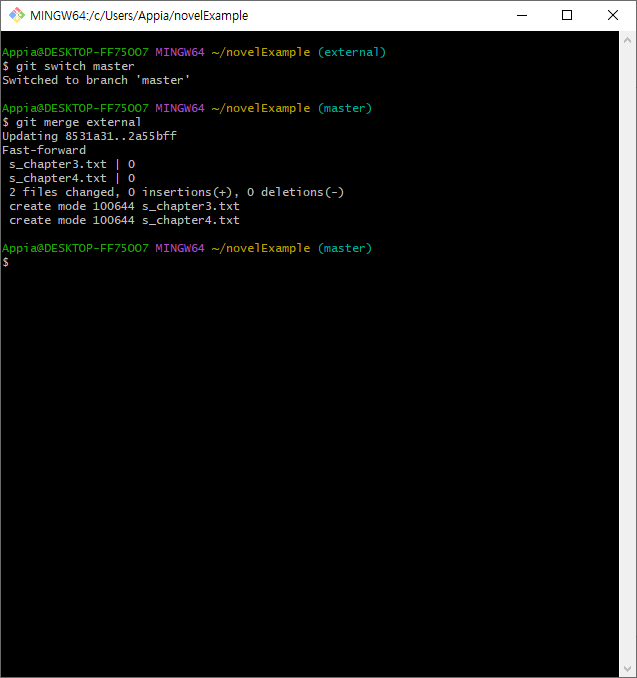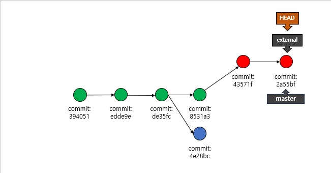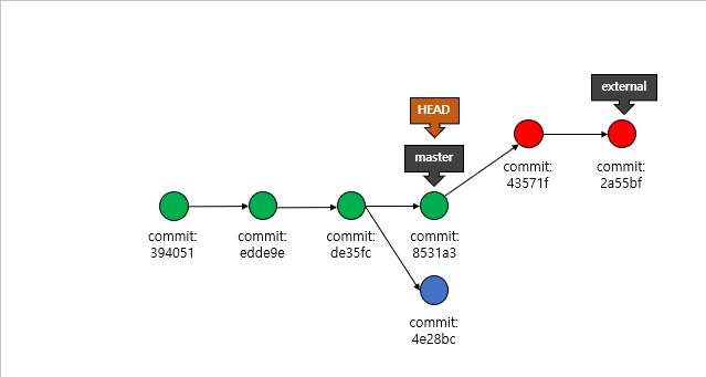그럼 위의 부분을 master(녹색)를 바탕으로 external(빨간) branch(브랜치)를 merge할 경우에는 어떨까요? 그럼 일단, git bash 기준으로 보겠습니다. 하기 명령어를 통해서, Merge를 진행하도록 하겠습니다.