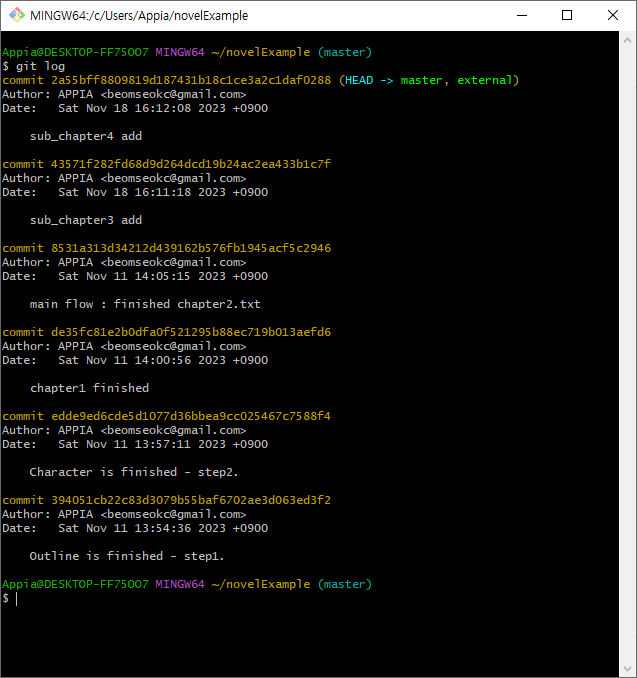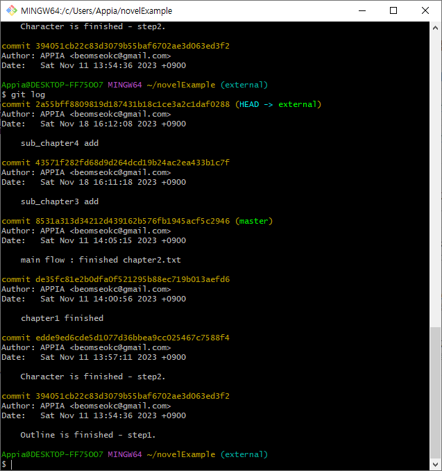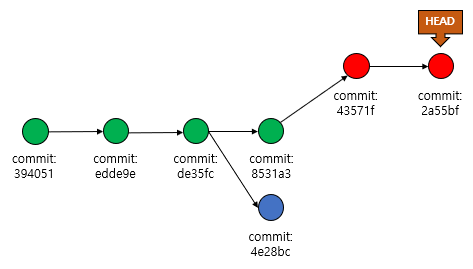 위의 과정을 진행하고 git log를 통해서, 현재 commit의 상태를 보면 다음과 같은 형태인 것을 알 수 있습니다.