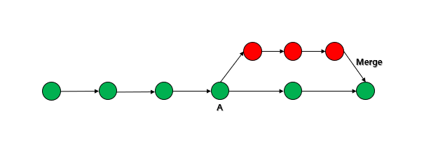 그럼 위의 workflow을 기준으로 간단히 다시 풀어서 이야기를 해보면, 위에서 보이는 그림에는 총 2가지 branch(브랜치)가 존재합니다. 여기에서, A지점에서 우리는 동시 작업을 하기 위해서, 빨간색 branch(브랜치)를 생성하였고, 여러 작업을 하면서 2번의 commit을 진행하였습니다. 그리고 나서, 이 부분을 기존 master branch(브랜치) merge를 진행합니다.