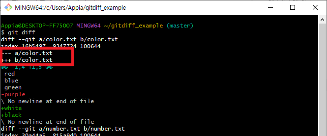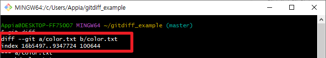 대체로 비교할 파일은 동일한 파일을 입니다. 깃에서는 이 파일에 대해서 a, b라고 부릅니다. 첫번째 줄은 항상 비교할 두파일에 대해서 명시를 하고 있습니다.