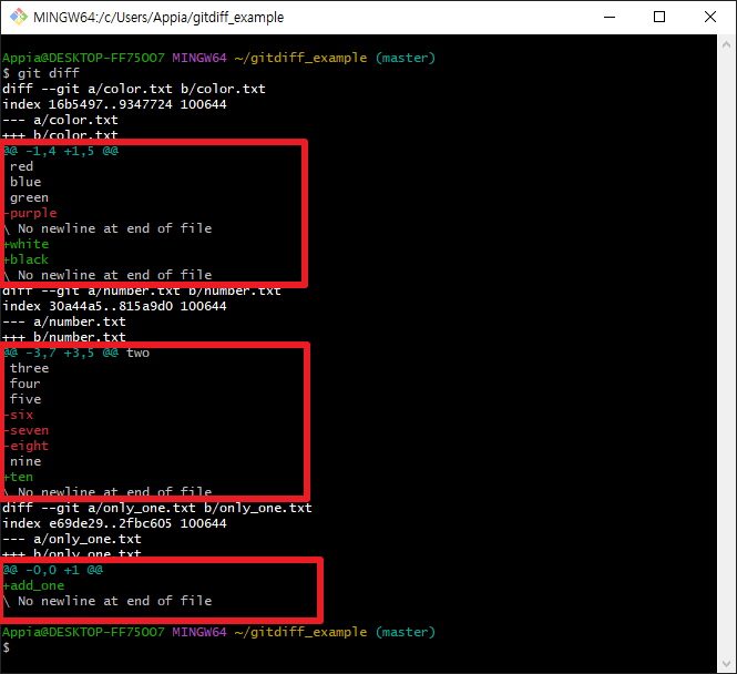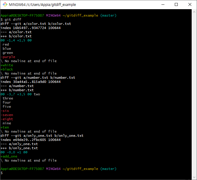 위에서 보시는 바와 같이 number.txt라는 파일의 전체 내용을 보여주지는 않습니다. 변경점이 있는 부분과 위 아래, 약간씩을 보여주는 것일 일반적입니다. 그리고 최초 그림에서 봤듯이 git diff의 경우 한개의 파일만 보여주지 않고, 여러개의 파일들을 보여줍니다. 다음의 예시를 한번 보겠습니다.