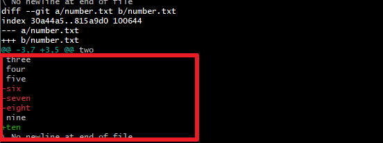 여기에서 앞에 -표시가 있고 빨간색 글씨로 되어 있는 부분은 a에는 있던 부분으로 b에서는 삭제된 부부입니다. 긜고, +부분인 ten은 b에서 추가된 것입니다. -기호가 있는 것은 b에는 없고, a에만 있는 것이고 +기호로 되어 있는 것은 a에는 없고 b에만 있는 것으로 보면 됩니다.