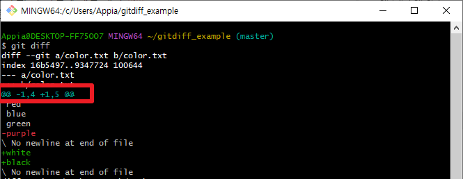 여기에서 보이는 -, +는 음수 양수가 아닙니다. 그냥 -는 a부분을 나타내고, +부분은 양수 부분을 나타냅니다. 그러면 위의 예시를 바탕으로 살펴보면, -1,4의 경우는 a는 1번째 줄 부터 4번째 줄까지 표시를 하고 +1,5부분은 b는 1번째 줄 부터 5번째 줄까지 표시를 한다는 것입니다. 그리고 종종 chunk header을 끝내는 @@ 뒤에 텍스트가 붙는 경우가 있는 데, 이 부분은 무시하셔도 됩니다.