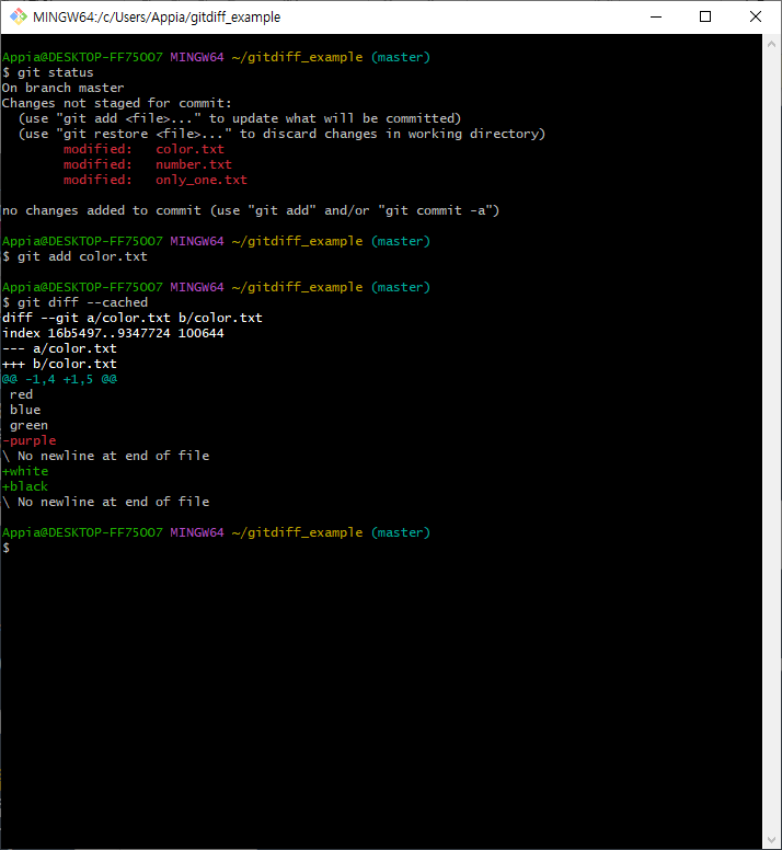 위에서 보이는 바와 같이 git diff --cahed를 실행하니, 앞서서 stage에 추가한 color.txt파일에 대해서만 변경사항을 확인합니다.
