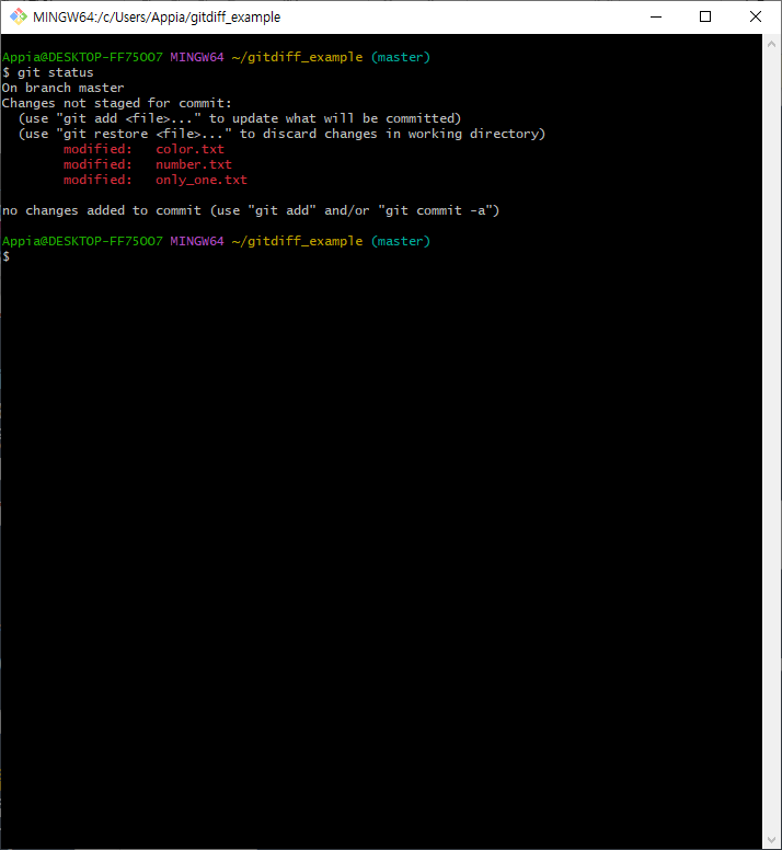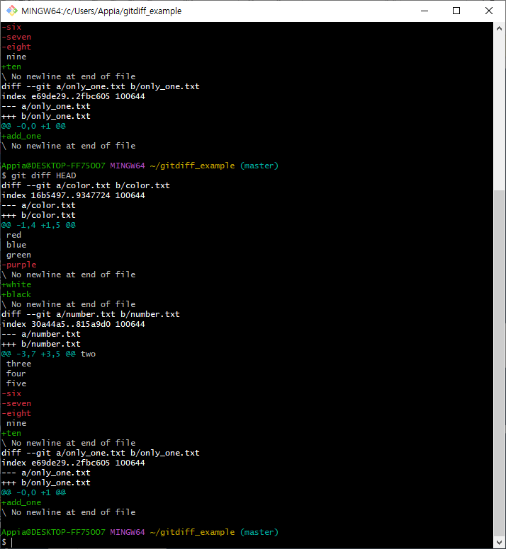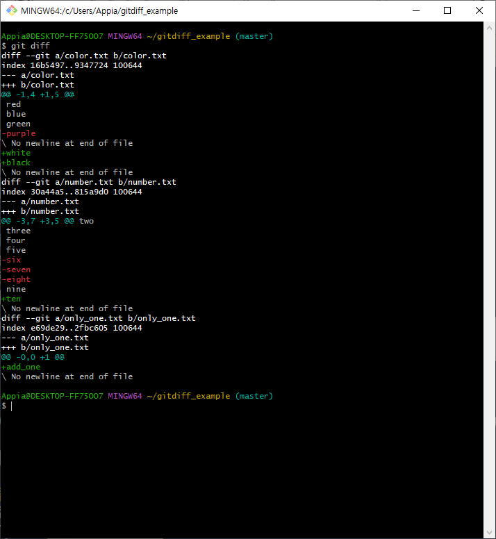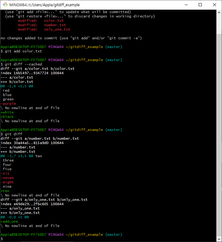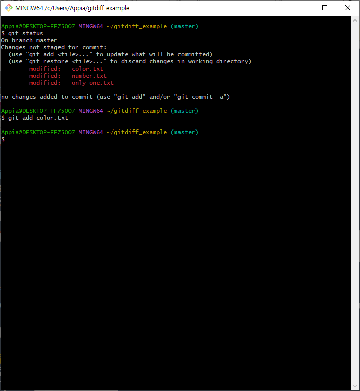 그리고 나서 다시 한번 git diff를 실행해 본 결과는 위에서 보이는 바와 같이 color.txt를 제외한 파일에 대해서 비교를 하는 것을 알 수 있습니다.