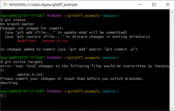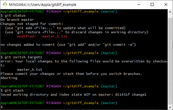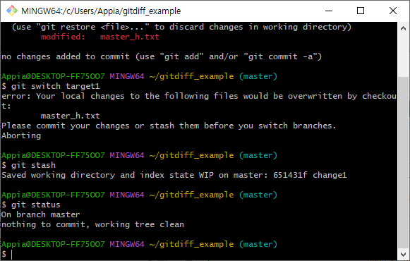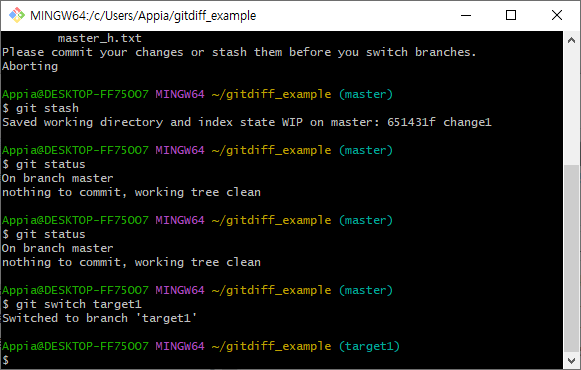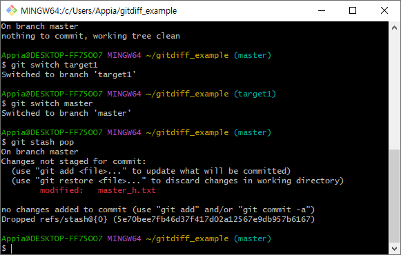 위의 과정을 통해서, 정상적으로 target1으로 branch(브랜치)전환을 이루었습니다. 그러면, 다시 master에서 이전에 stash한 변경사항들을 불러오도록 하겠습니다. 먼저, 다시 git switch 명령어를 통해서 master 브랜치로 이동하도록 하겠습니다.