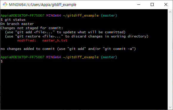 위의 결과로 다시 한번 "git status"로 현재 branch(브랜치)의 변경사항에 대해서 확인을 해보도록 하겠습니다. 이전에 변경사항이 없는 것처럼 나왔는데, 다시 변경사항이 생겼습니다. 즉, 임시 저장된 변경사항에 대해서 다시 불러온 것이라고 생각하시면 됩니다.