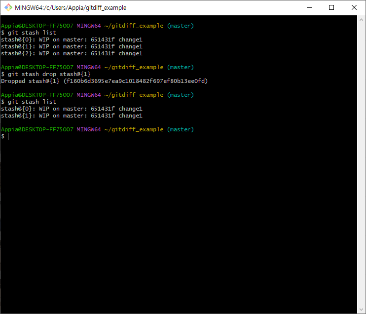 위에서 보이는 바와 같은 결과를 나타내는데, git stash apply의 경우에는 git stash 항목들이 사라지지 않습니다. 그러면 다음 예시를 보면서 한번 살펴보겠습니다.