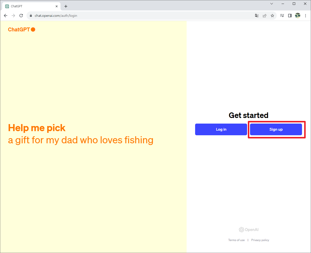 그러면 다음과 같은 페이지가 나타날 것입니다. 여기에서, 처음 하시는 분들은 아마도, OpenAI계정이 없을 것입니다. 그래서, 이 하기에 보이는 [Sign up]부분을 클릭하여 주시길 바랍니다.