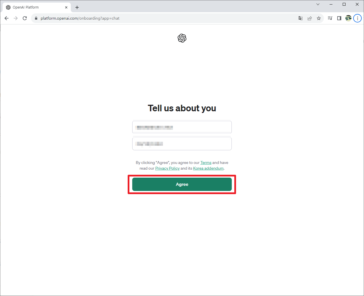 그리고 나면, 이름과 생년월일에 대한 정보를 입력하도록 합니다. 이름의 경우에는 Gmail에 연결된 이름을 자동으로 불러옵니다. 그리고 나서, (선택적으로) 생년월일을 입력하고 [Agree]버튼을 클릭하여 주시길 바랍니다.