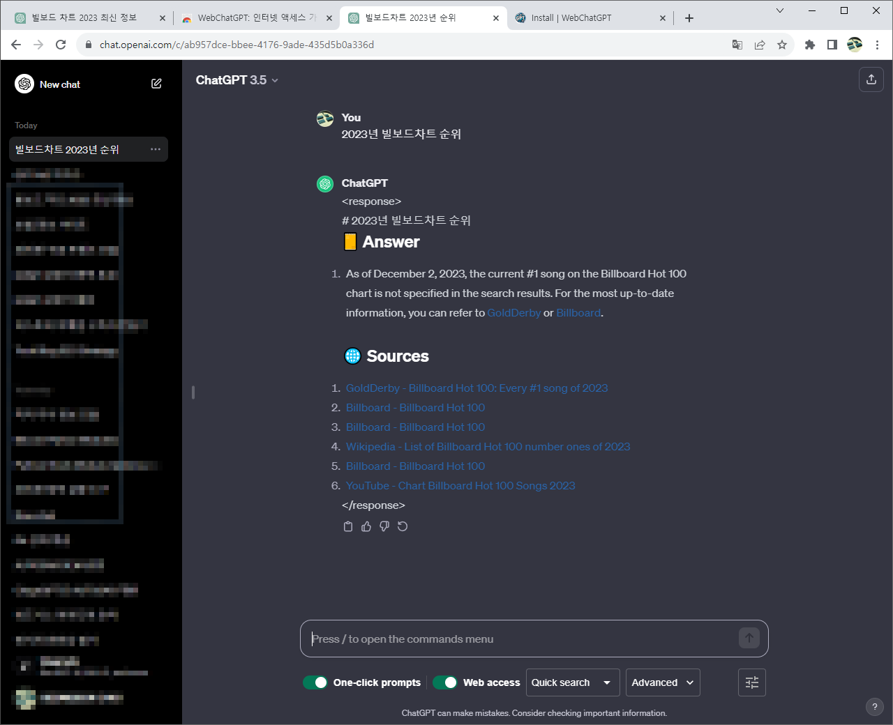 그리고 나서, 2023빌보드 차트 순위에 대해서 검색하면 다음과 같이 2023년 정보이지만, 출력이 나타나는 것은 알 수 있습니다.