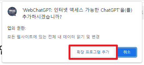 위의 과정을 진행하시면 다음과 같이 확장 프로그램 추가하는 것에 대해서 추가 확인하는 다이얼로그가 나타날 것입니다.