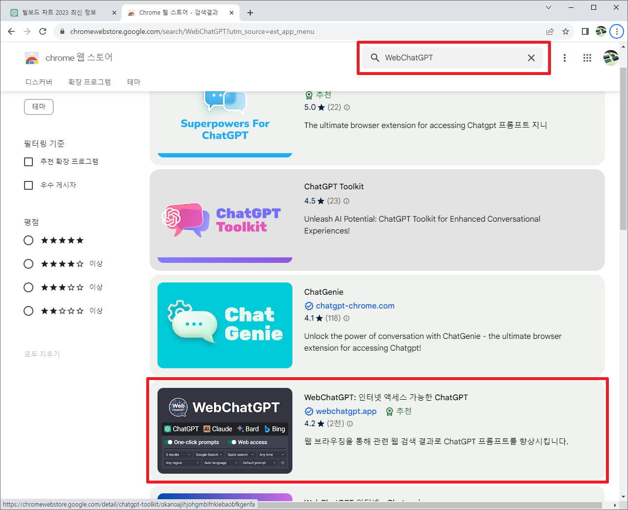 위의 과정까지 오신다면, 검색하는 부분에서 "WebChatGPT"부분을 검색해수시길 바랍니다. 그런 이후에 다음과 같은 Extension "WebChatGPT:인터넷 액세스 가능한 ChatGPT"부분을 클릭해 주시길 바랍니다.