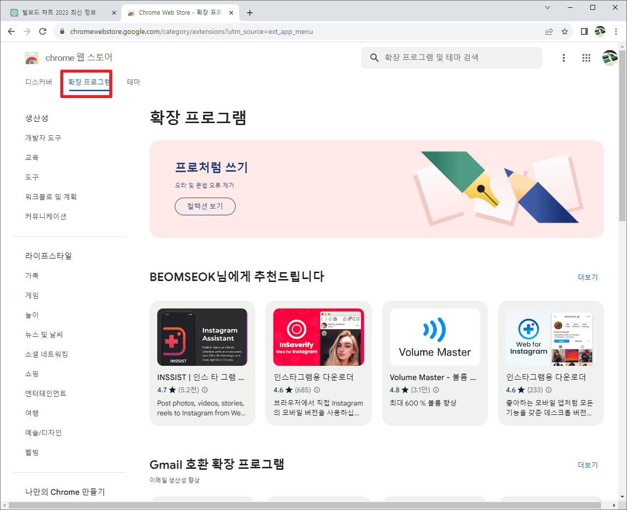 위의 과정을 진행하면, Chrome 웹스토어로 이동할 것입니다. 여기에서 좌측 상단에서 [확장프로그램]을 선택해주시길 바랍니다.