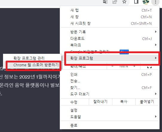 먼저, 화면 우측에 더보기 버튼을 클릭하셔서, [확장 프로그램] - [Chrome 웹 스토어 방문하기]부분을 클릭하여 주시길 바랍니다.
