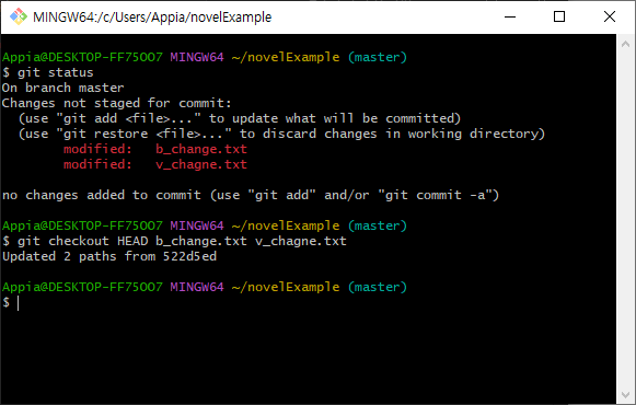 위의 명령어를 바탕으로, 예제로 생성한 b_change.txt와 v_change.txt 파일 원복하도록 하겠습니다.