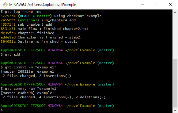 그러면, 이제는 restore를 통해서 변경사항을 폐기하는 방법에 대해서 보도록 하겠습니다. 여기에서 임의적으로 변경사항을 만들고 몇번의 commit을 진행해보도록 하겠습니다.