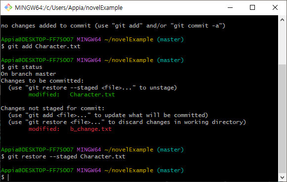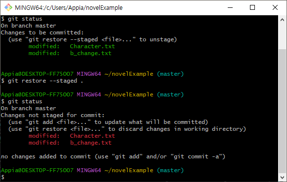 이와 같은 방식으로 스테이징을 취소할 수 있습니다.