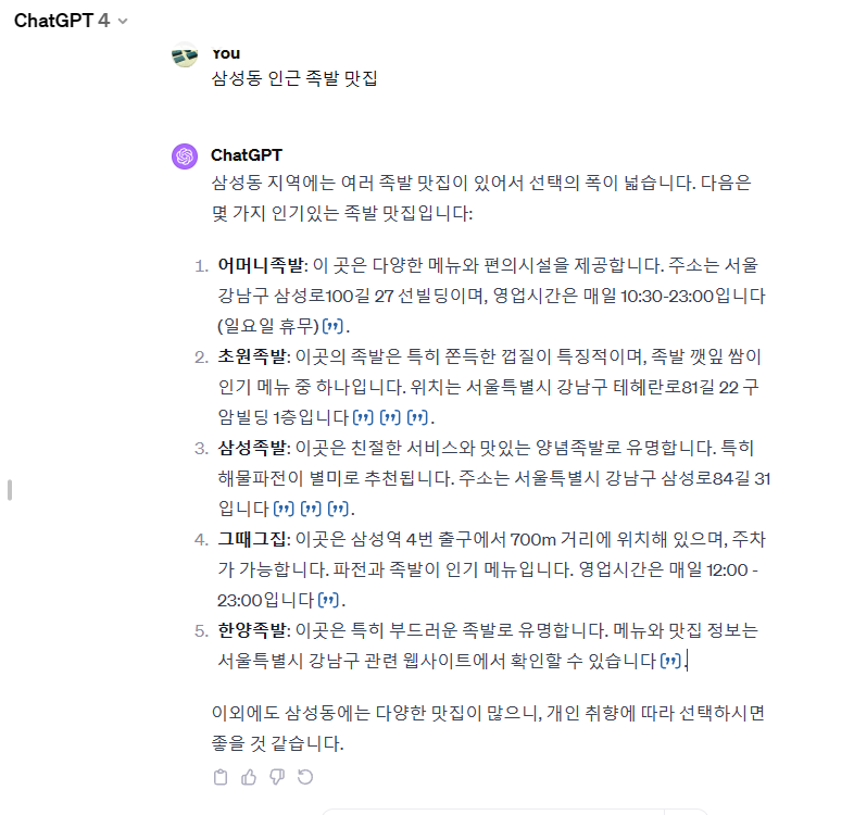 위에 보이는 부분과 같이 제가 삼성동 인근 족발 맛집을 검색하였을 경우에, ChatGPT4의 경우 웹 서칭을 통해서 인근에 있는 맛집을 검색합니다. 하지만, ChatGPT3.5의 경우에는 찾는 방법에 대한 원록적인 방법에 대해서는 이야기를 해주나, 실제 맛집을 검색해주지는 않습니다.