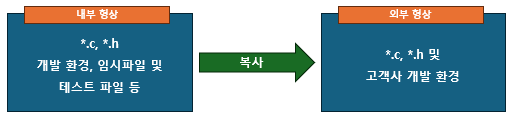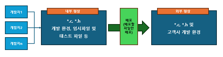 내부와 외부의 형상은 명확하게 분리하여 관리하고 있습니다. 내부 형상은 내부 개발자들이 작업하는 개발 환경에 해당합니다. 즉, 개발자들이 개발하고 검증한 코드 및 관련된 데이터들이 포함되어 있습니다. 외부 형상은 고객과 공유하는 데이터라고 보시면 됩니다. 즉, 내부 형상에서 공유가 필요한 파일들만 선별하여 고객사에 전달하게 됩니다. 아마도, 현업에서 소스 코드 배포를 하는 많은 개발자 분들께서는 이와 같은 형태로 내부/외부 형상을 분리하여 운영하고 있을 것입니다.