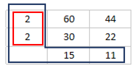 일단 간단히 한번 최대 공약수를 구해보도록 하겠습니다. 두 정수 예를 들면 60, 44를 2란 정수로 나누어 보도록 하겠습니다. 몫으로 30, 22가 나옵니다. 다시 이를 2로 나누어 보도록 하겠습니다. 그럼 15, 11이 나옵니다. 15와 11은 실제 나누어 지는 정수가 없으므로, 최대 공약수는 4가 됩니다. 여기서 각각 나눌 때 사용한 수를 곱하여 최대 공약수를 구할 수 있습니다. 여기서 최소 공배수는 최대 공약수 * 11 * 15입니다.
