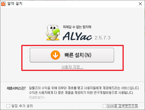 그런 후에 [빠른 설치] 부분을 클릭하시면 됩니다. 물론, 사용자 지정이라고 하더라도 설치 폴더 및 앞서 말한 알집 추가 설치 및 Zum을 검색엔진으로 부분을 추가 설정할 수 있는 부분입니다.