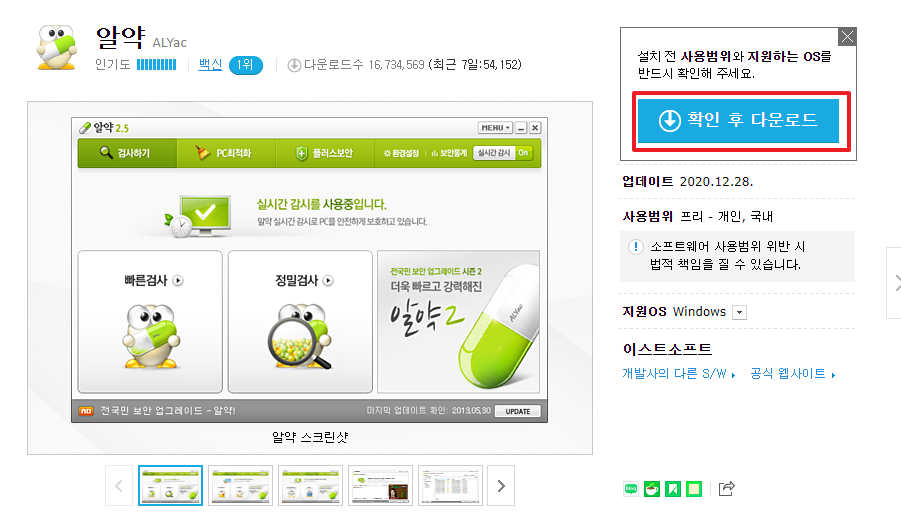 위에서 무료 다운로드를 클릭하시면 다음과 같이 다시한번 사용범위 및 지원하는 OS에 대해서 확인해주라는 안내와 함께 [확인 후 다운로드]라는 부분이 나타납니다. 이 부분을 클릭하여 다운로드 하여 주시길 바랍니다.