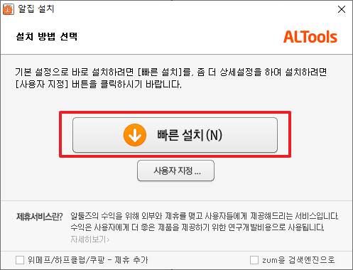 그럼 다시 한번 설치 방법에 대해서 명시 하고 있습니다. 이 때에도 화면 하단에 제휴 관련된 안내가 나옵니다. 이 부분을 체크 해제 하여 주시길 바랍니다.